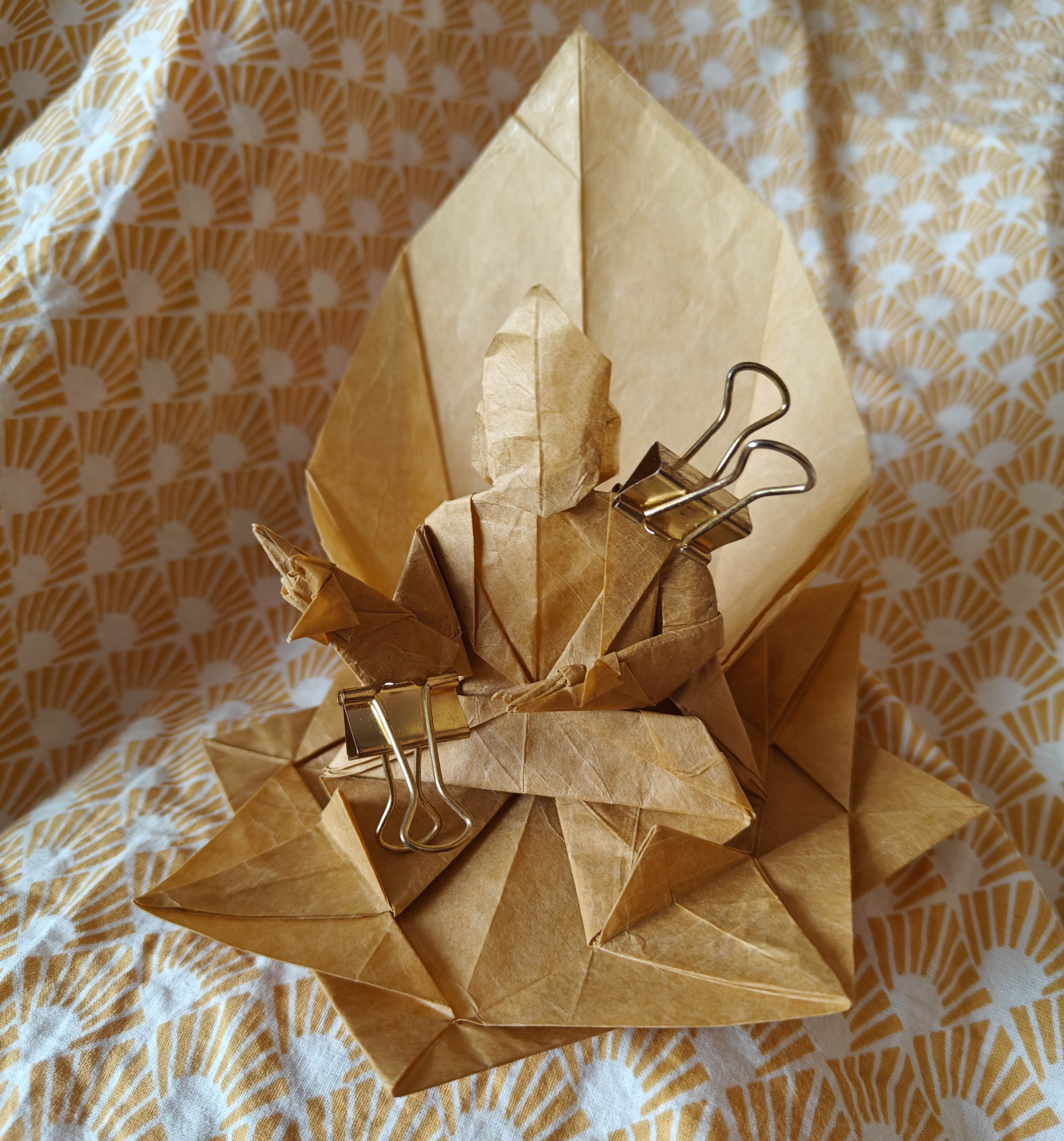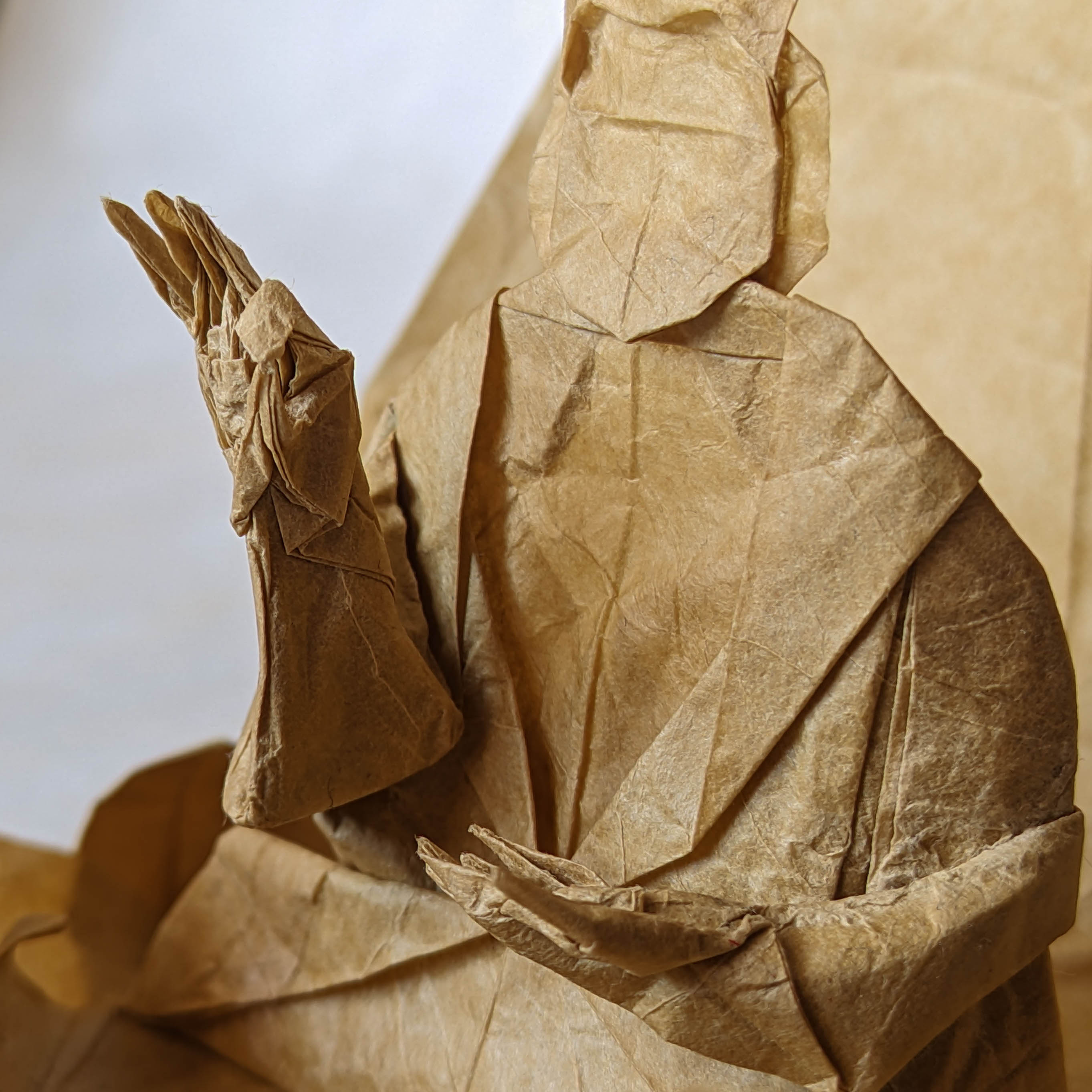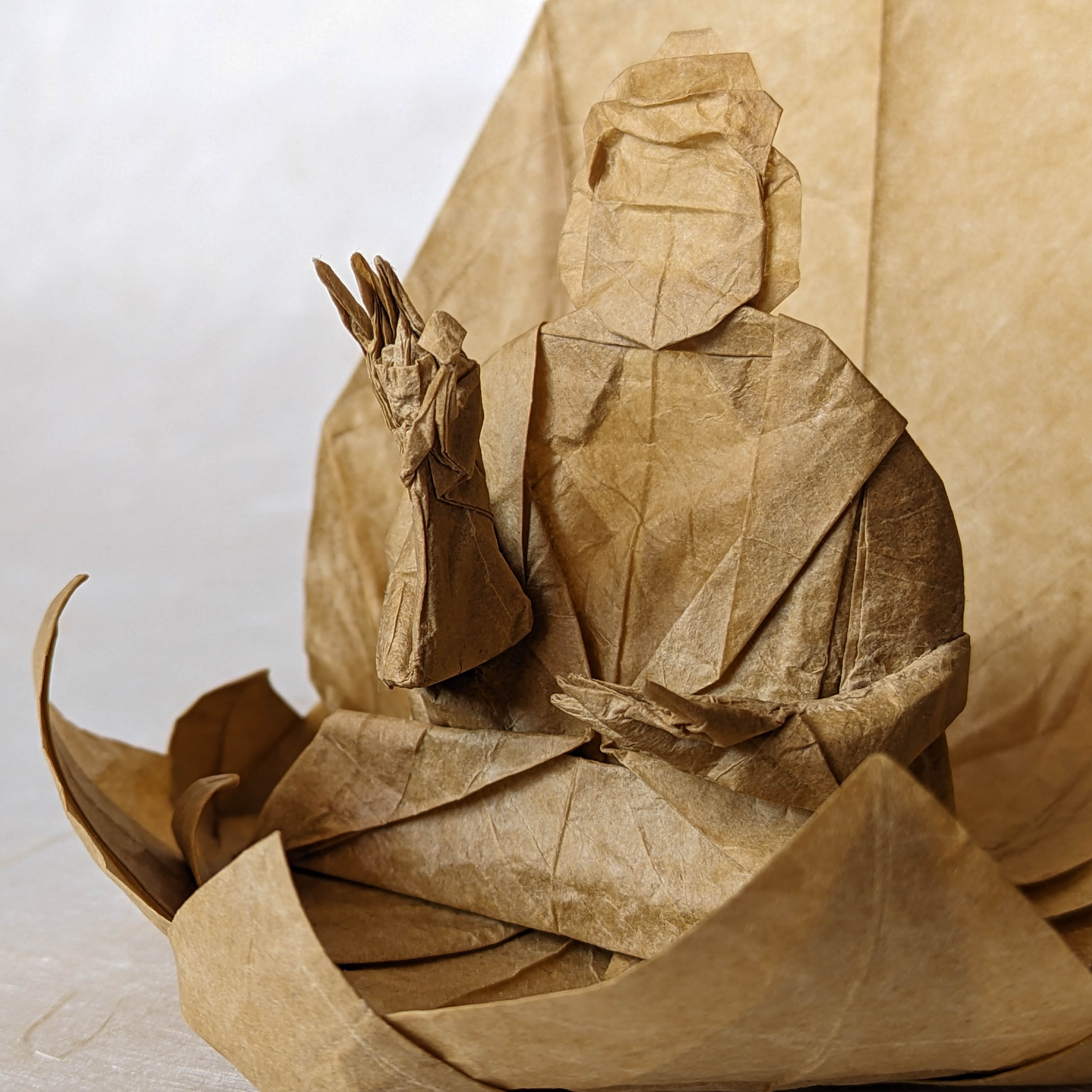 The model is folded from a single square of double tissue paper. The usual gesture seemed less interesting to me, so I tried to give him the Vitarka Mudra instead, a gesture that symbolizes the sharing of wisdom and knowledge.