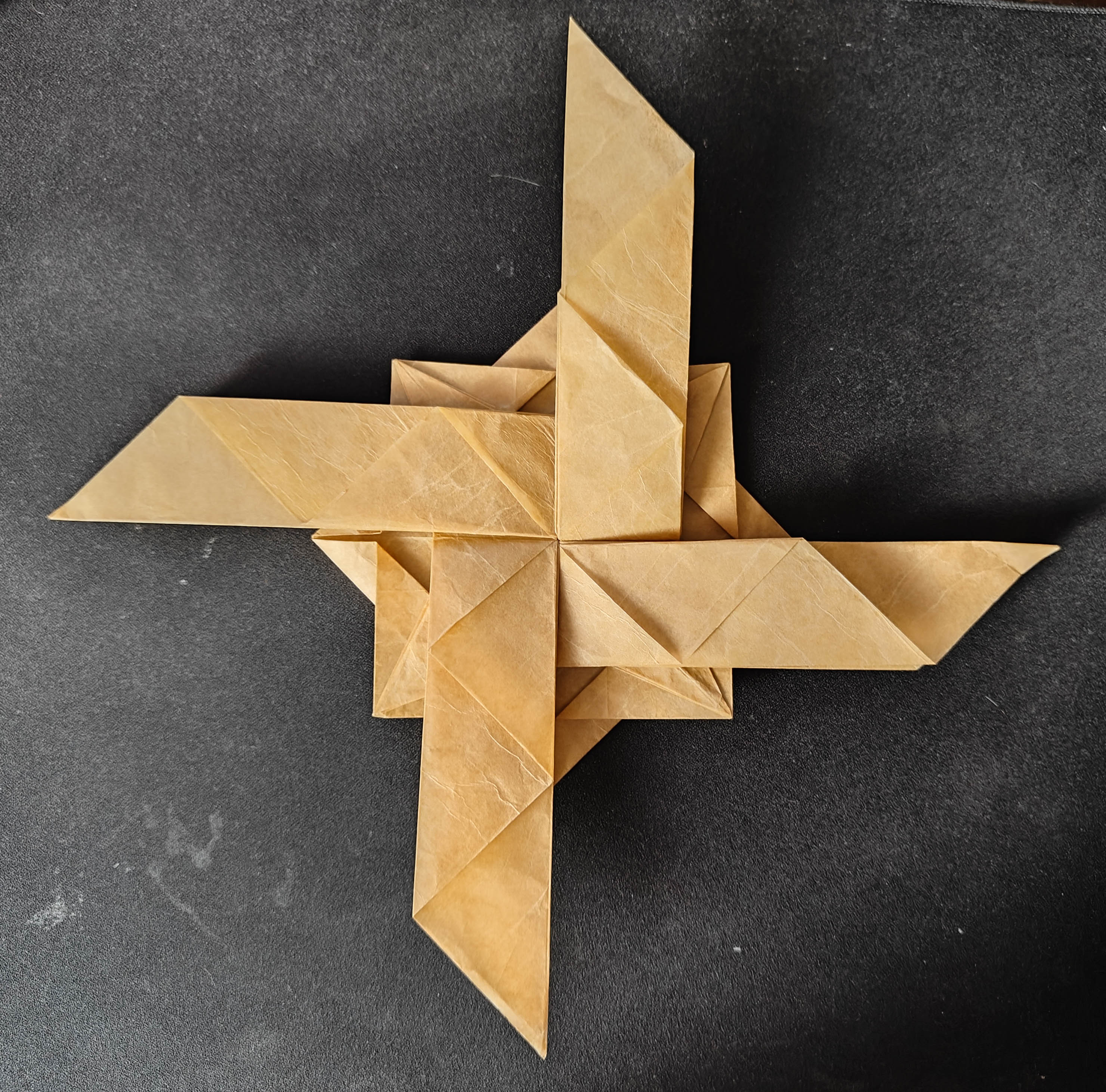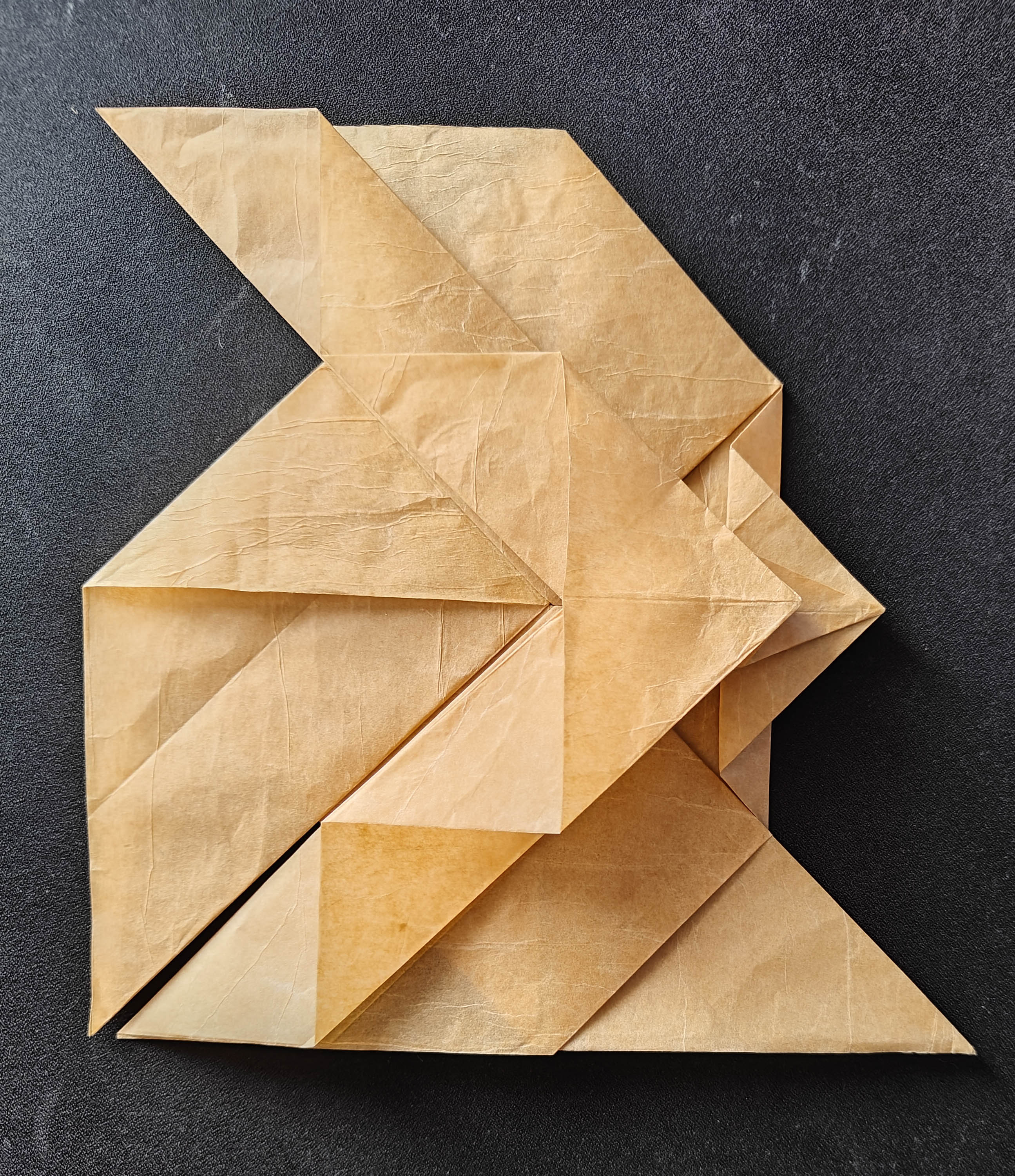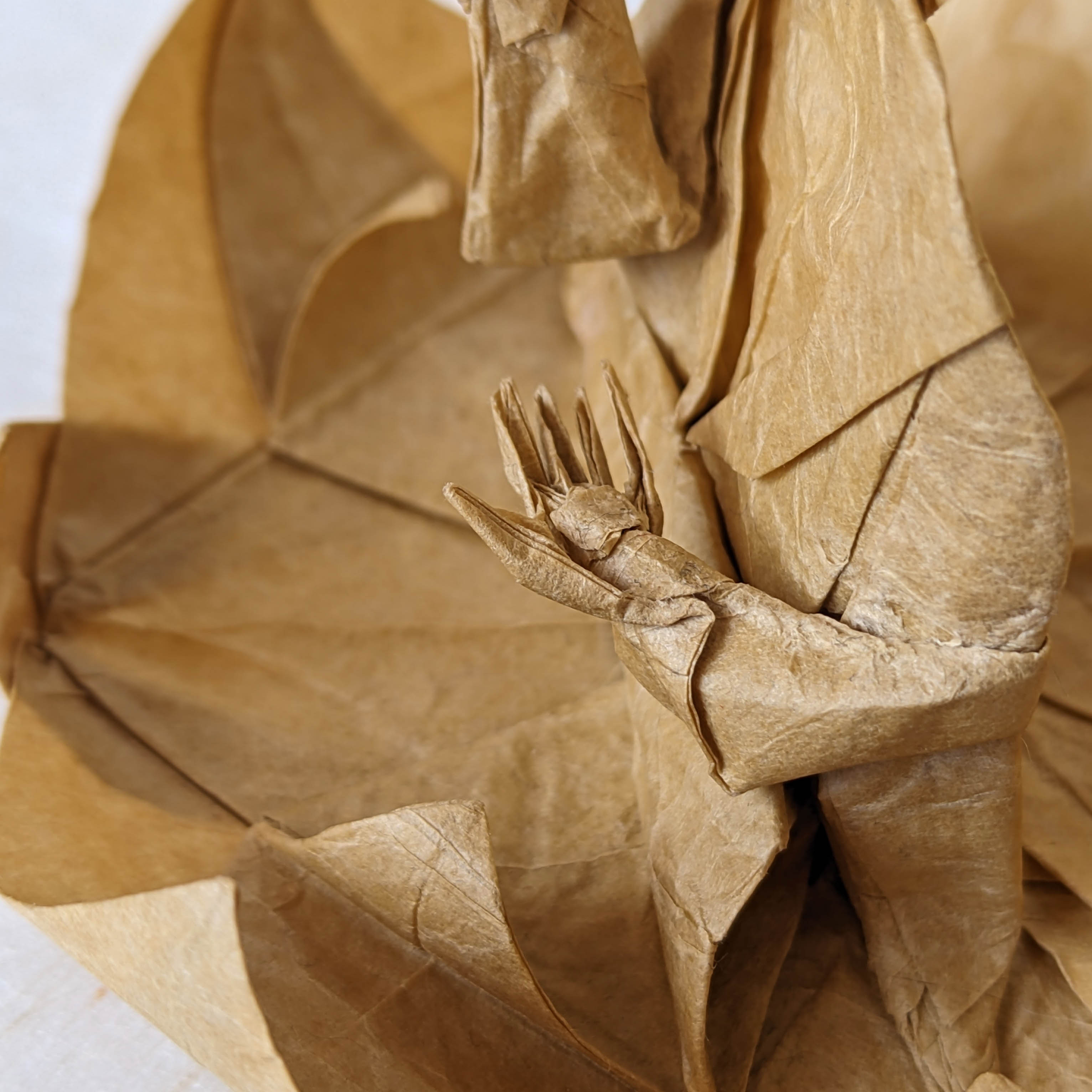 The model is folded from a single square of double tissue paper. The usual gesture seemed less interesting to me, so I tried to give him the Vitarka Mudra instead, a gesture that symbolizes the sharing of wisdom and knowledge.