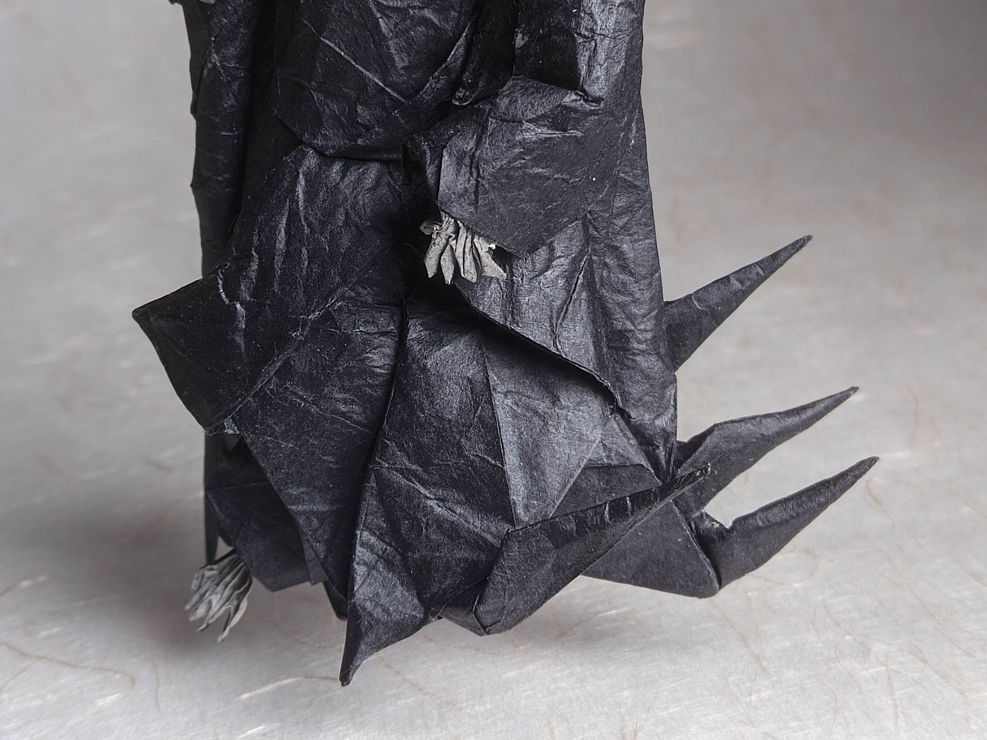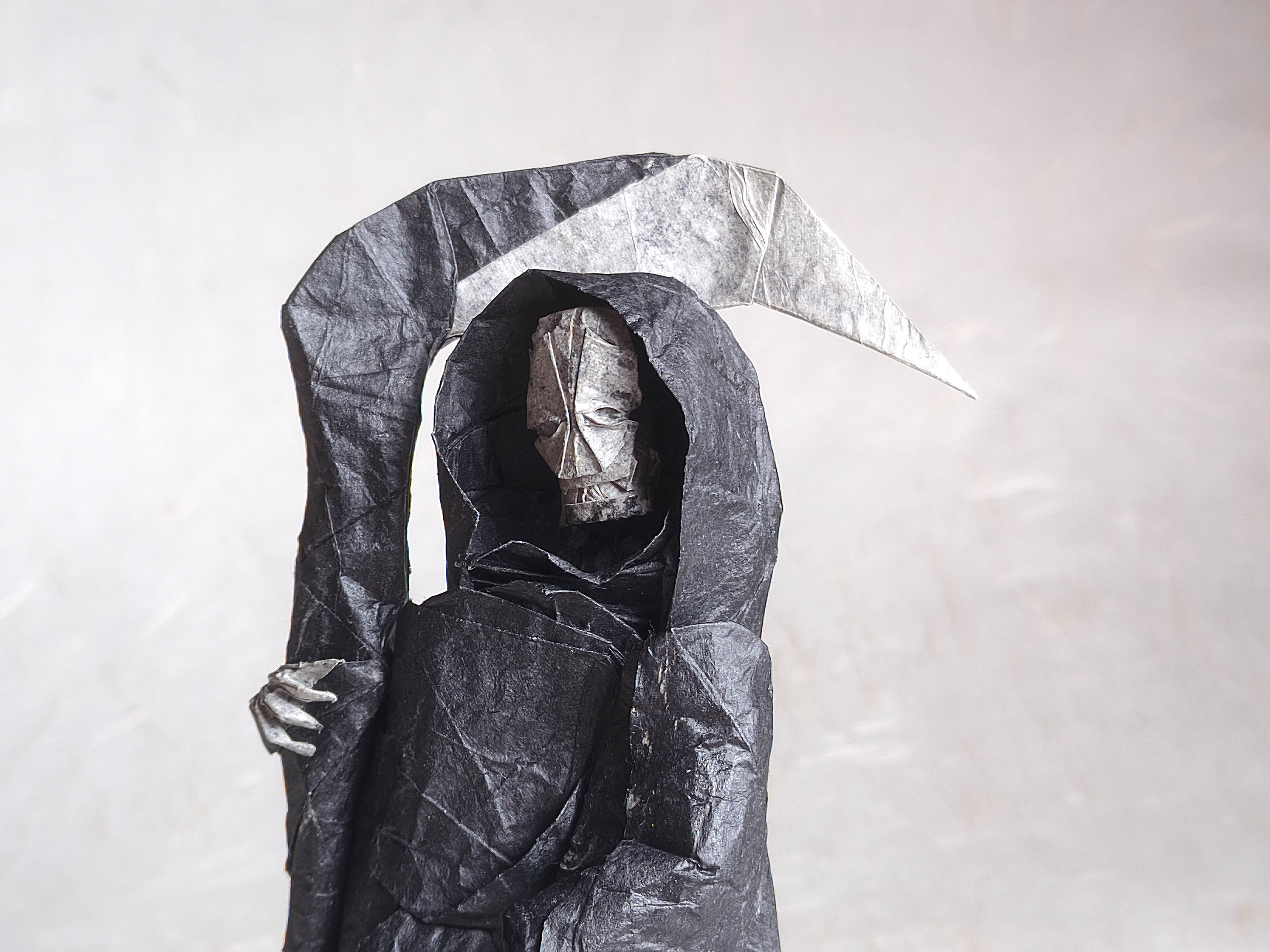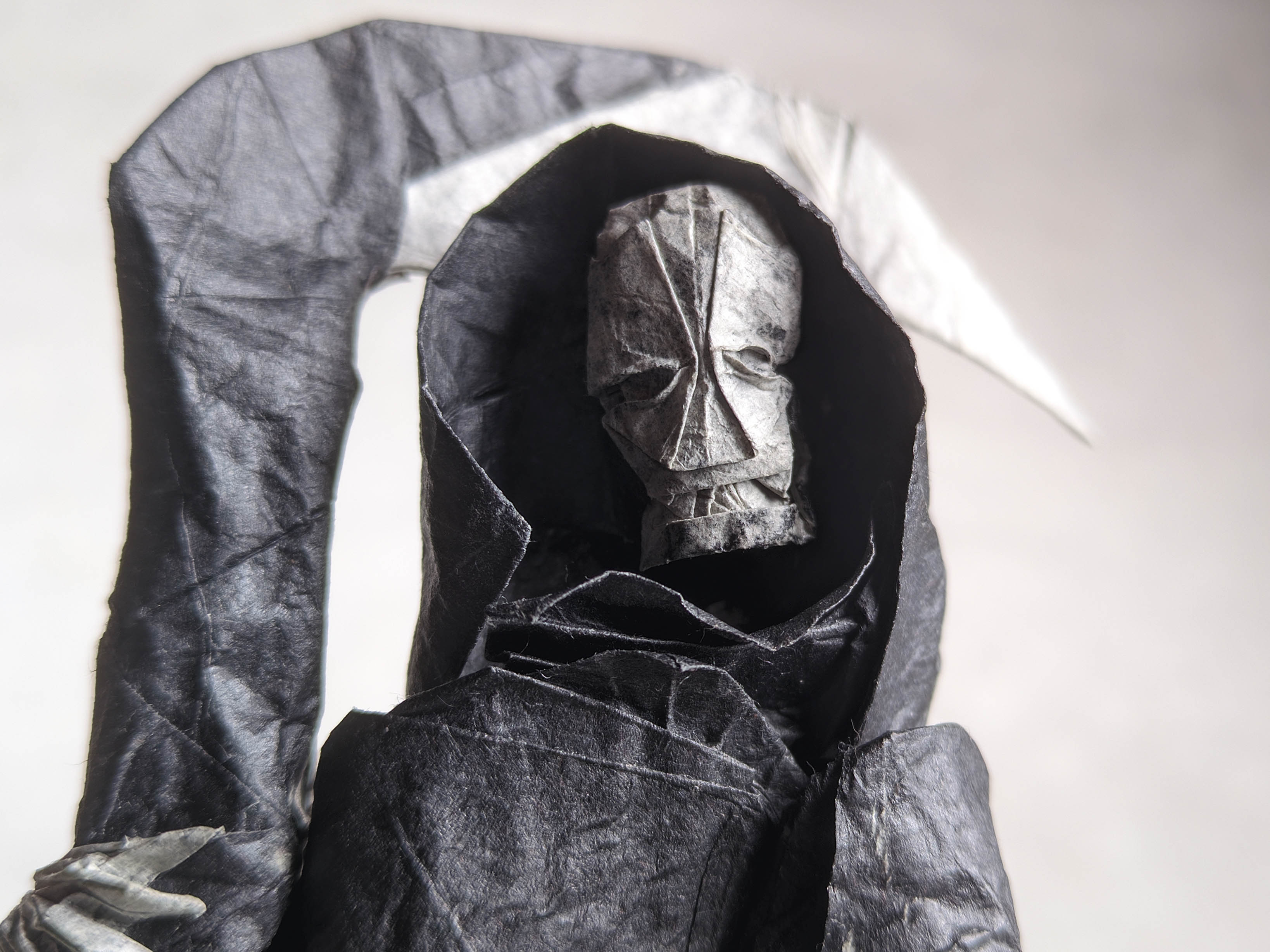 Another model that has been sitting on my shelf for months. It was an interesting diagram to follow, and I liked the folding process. I used ~50x50 double tissue paper, though I think that wasn't quite enough for shaping skull and hands. I love how the bones apper gray due to the natural paper blending effect.