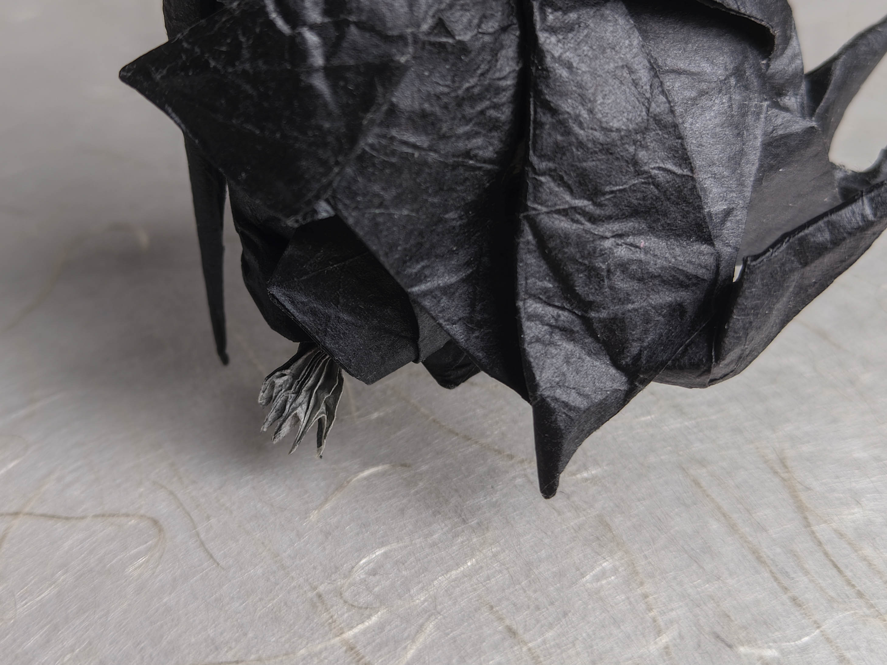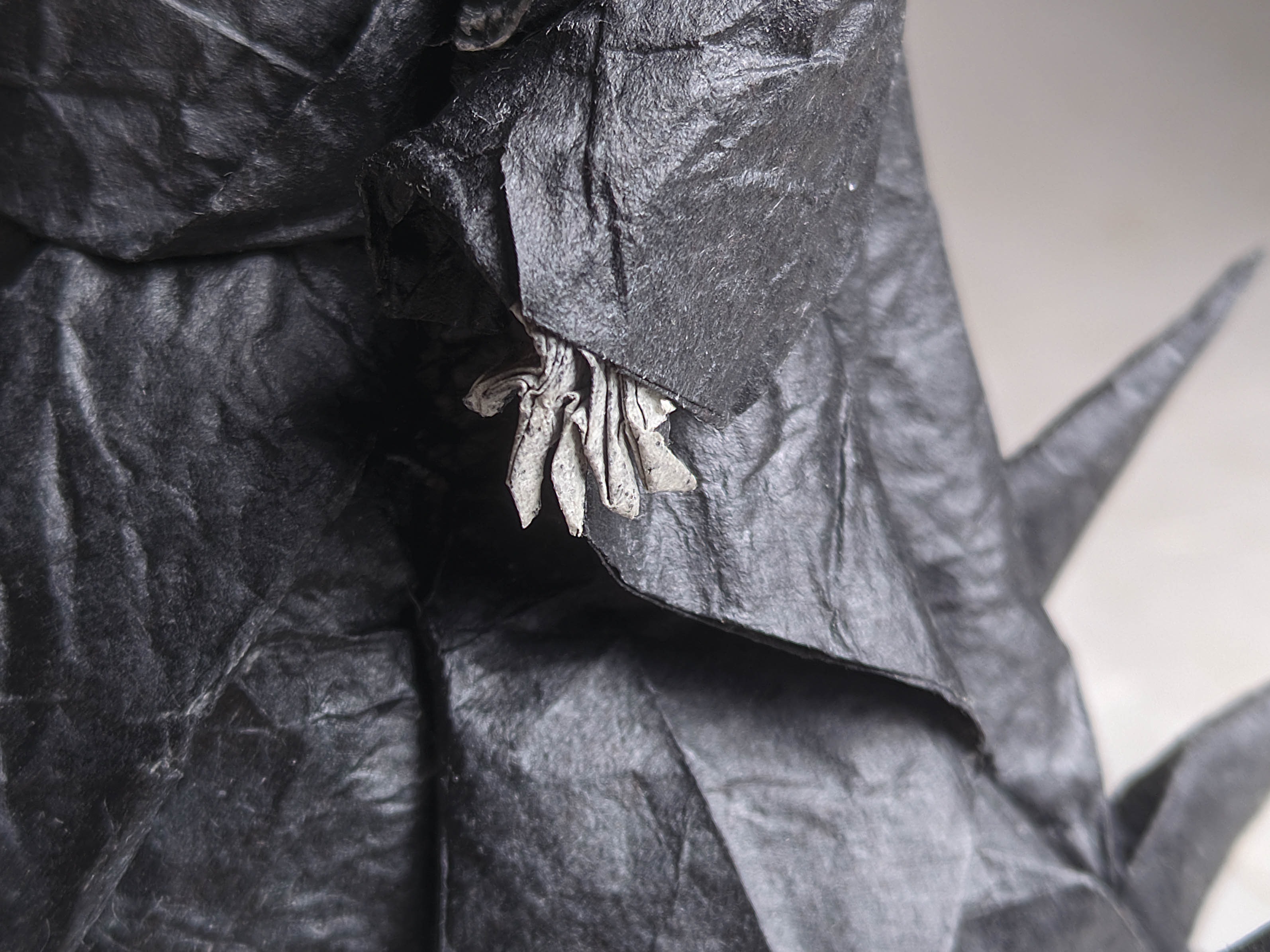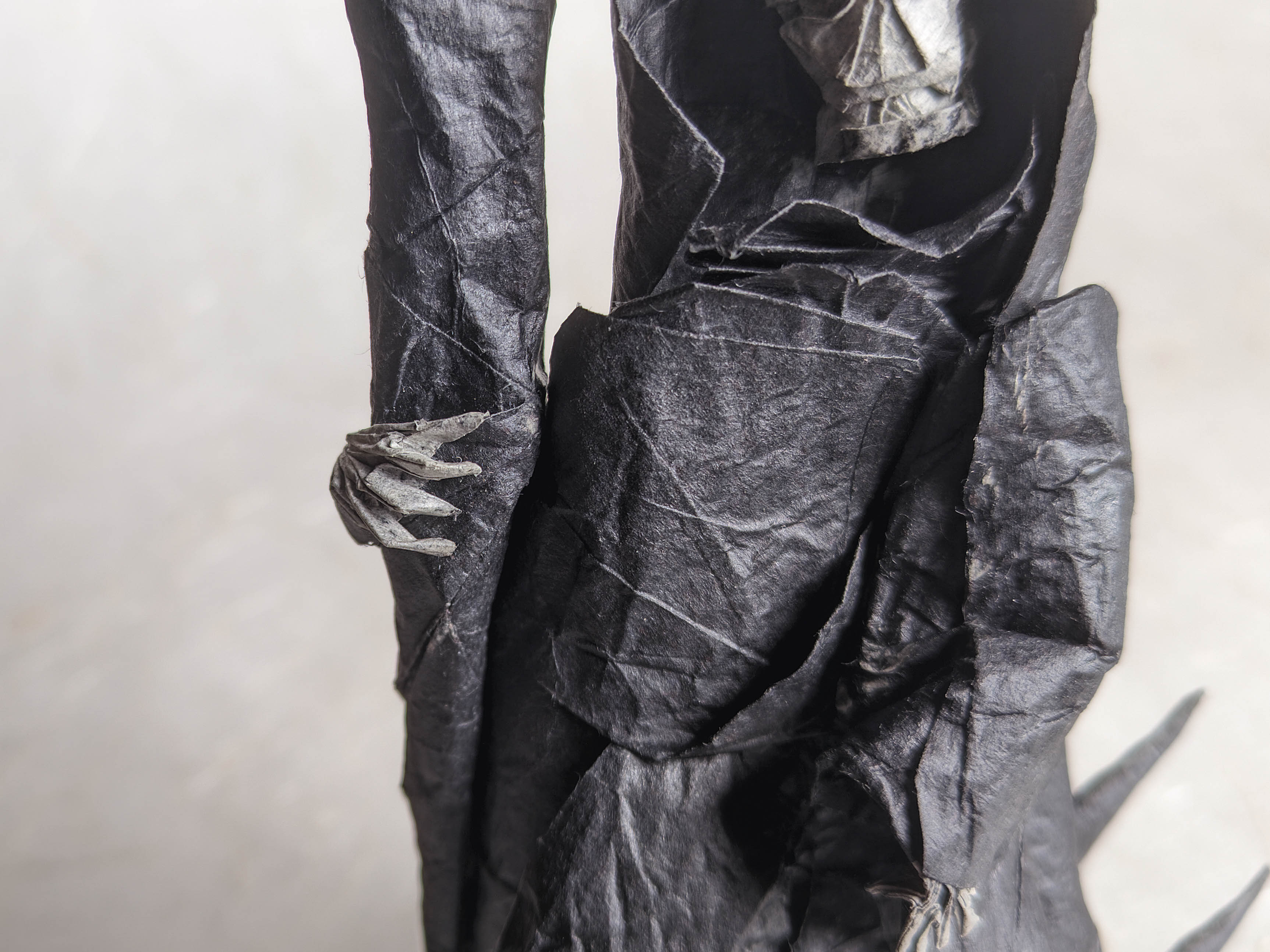 Another model that has been sitting on my shelf for months. It was an interesting diagram to follow, and I liked the folding process. I used ~50x50 double tissue paper, though I think that wasn't quite enough for shaping skull and hands. I love how the bones apper gray due to the natural paper blending effect.