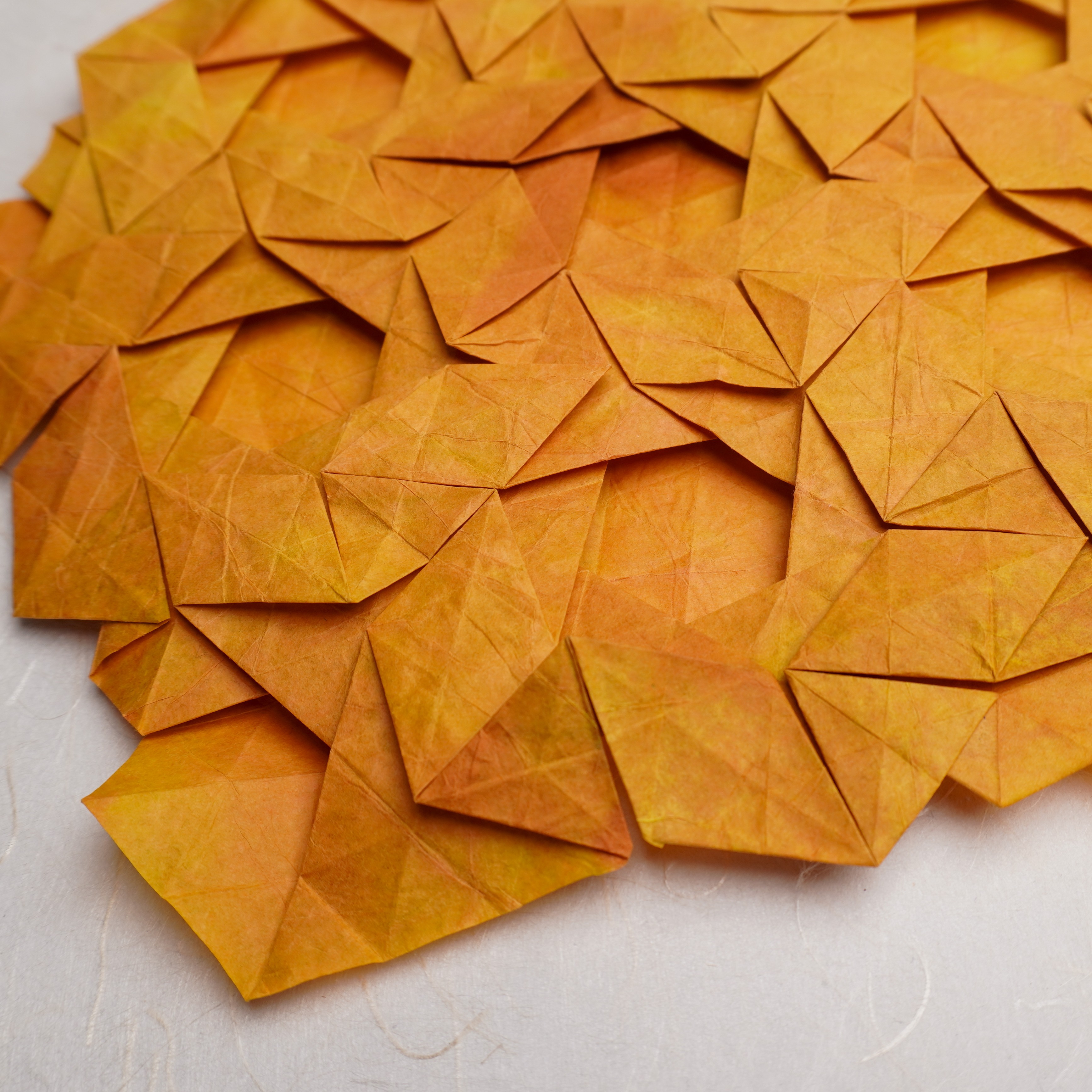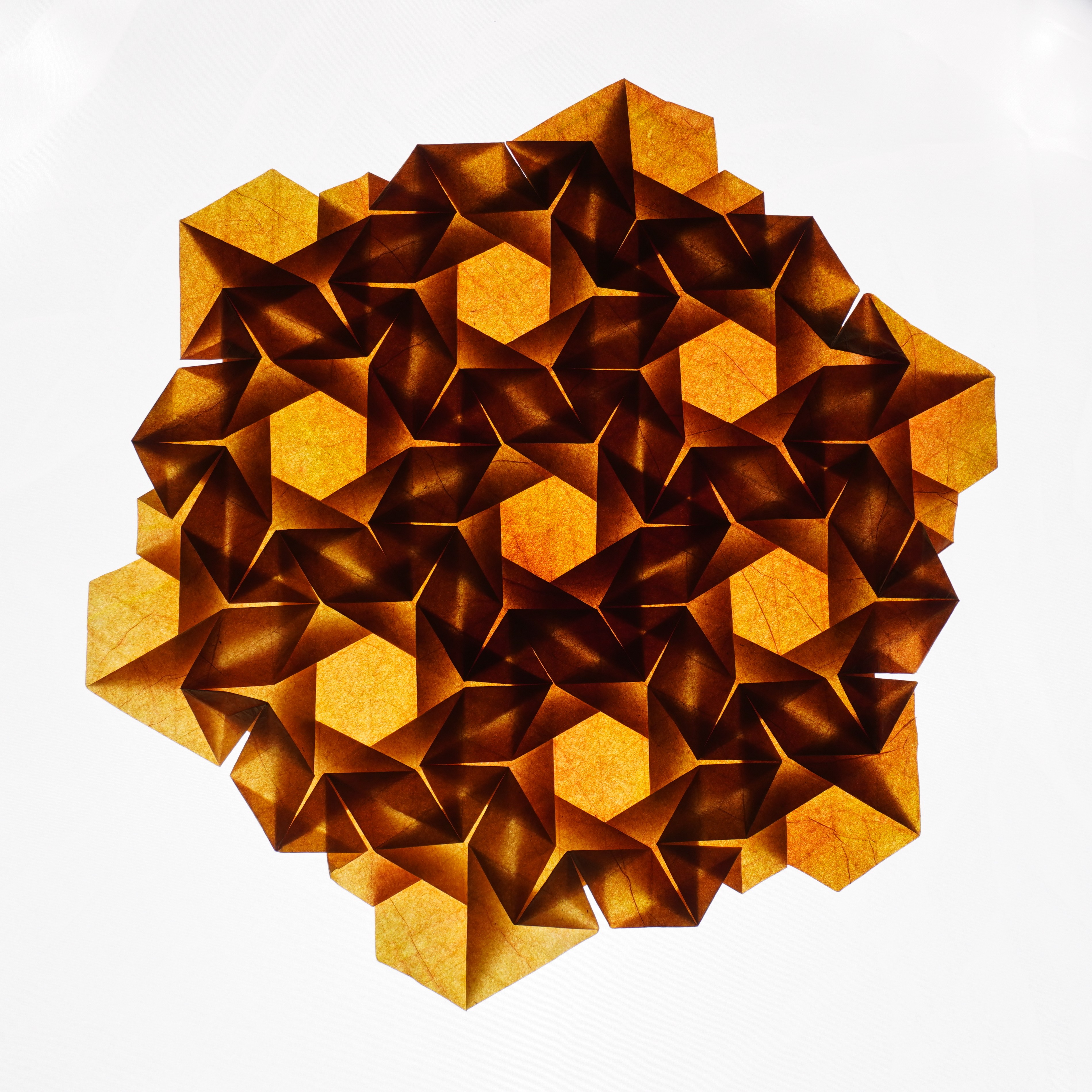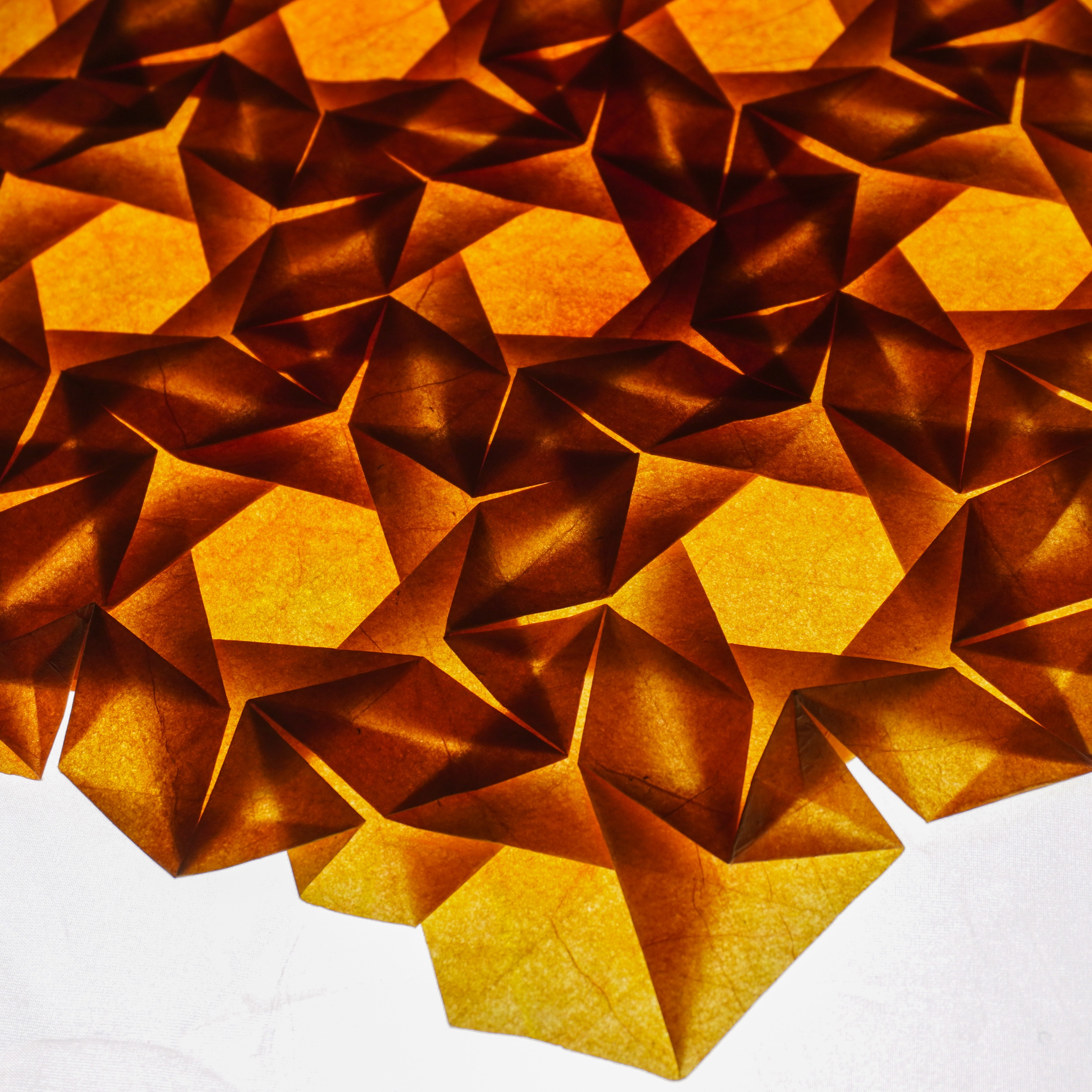 This is a smiple tessellation made from a basic combination of triangular twists and rhombuses. For this model, I used wenzhou + tissue paper, dyed with sheen ink. I’m still testing different ways to dye paper, and I really liked how this one turned out — it looks like autumn leaves. It’s not perfect, but the result is good.