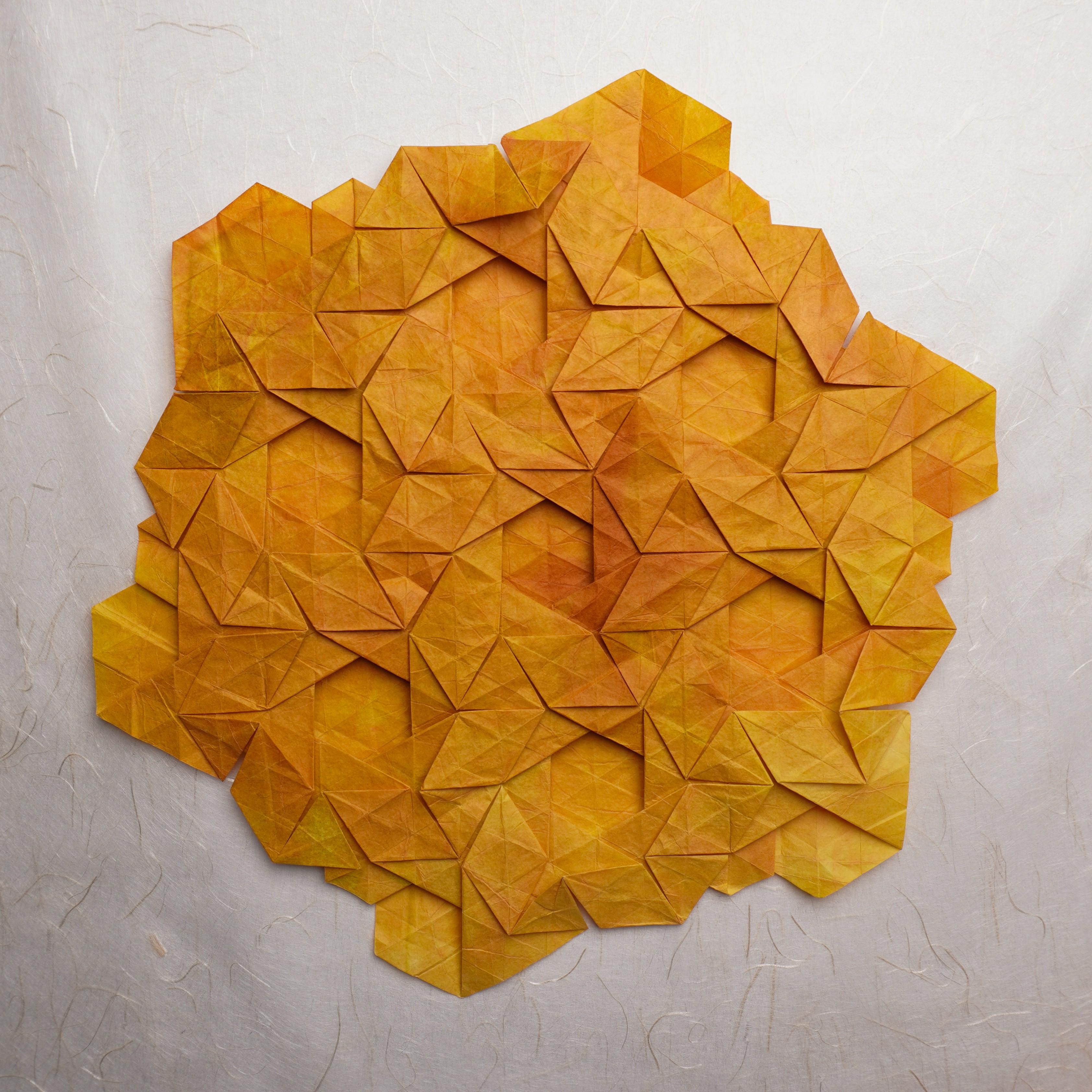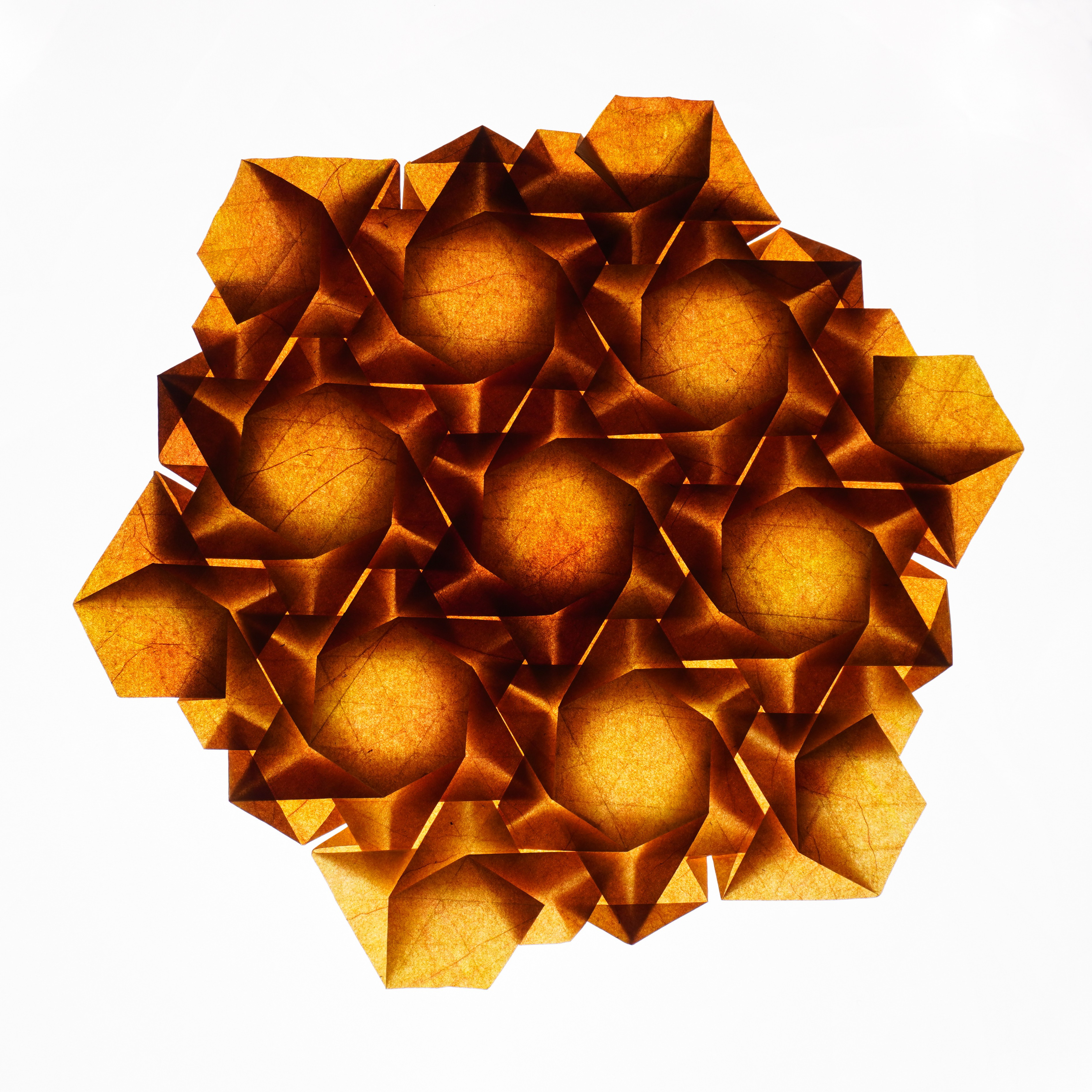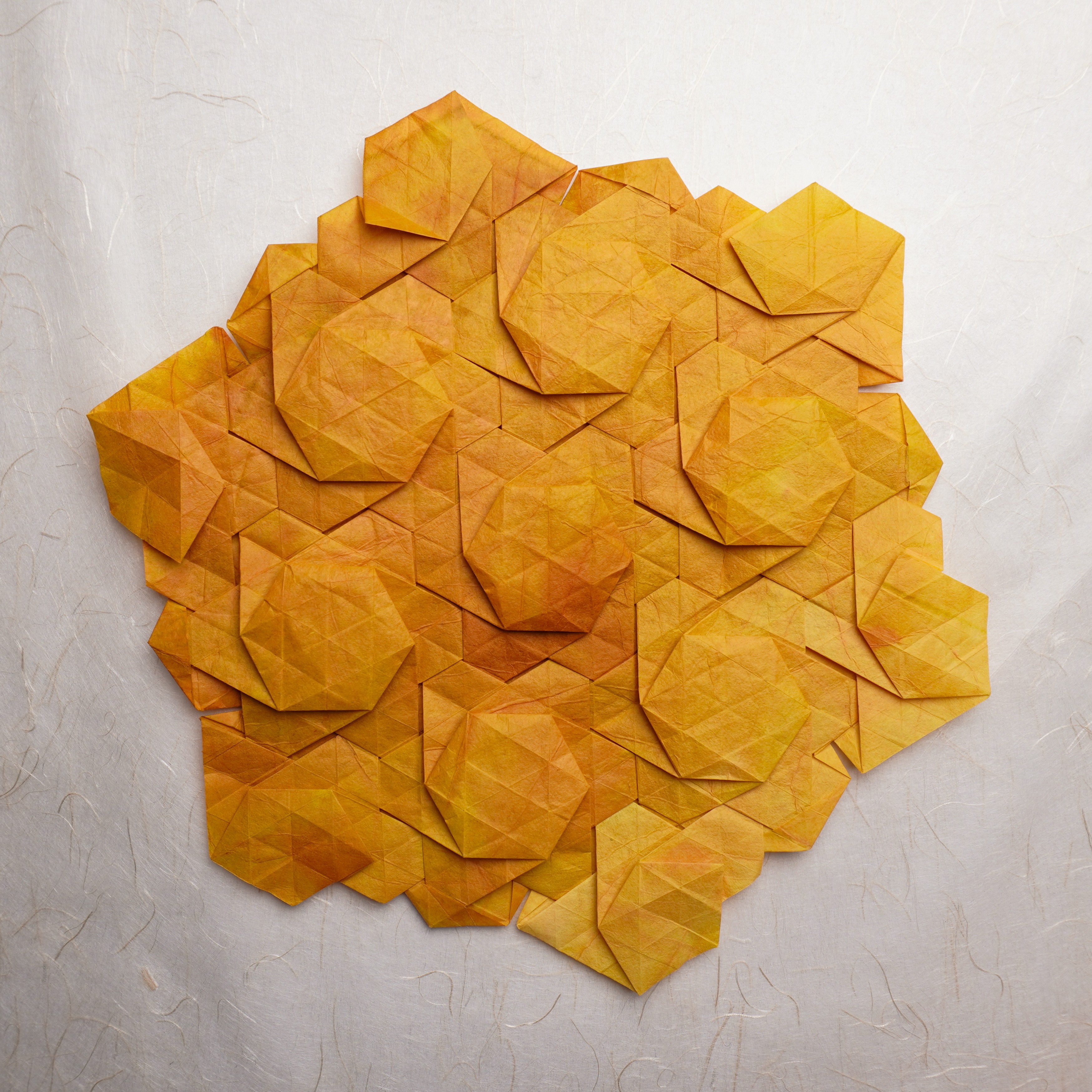 This is a smiple tessellation made from a basic combination of triangular twists and rhombuses. For this model, I used wenzhou + tissue paper, dyed with sheen ink. I’m still testing different ways to dye paper, and I really liked how this one turned out — it looks like autumn leaves. It’s not perfect, but the result is good.
